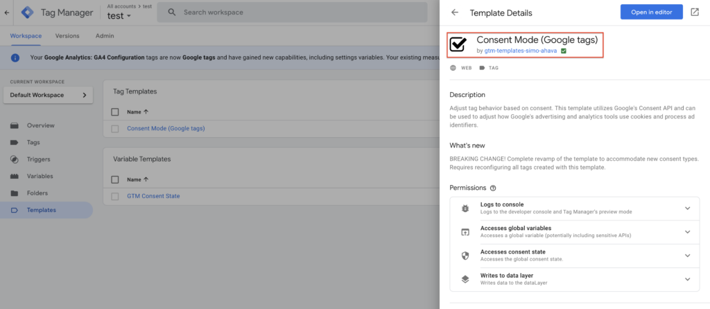This template simplifies the process of implementing Consent Mode v2 in GTM. It includes features like: