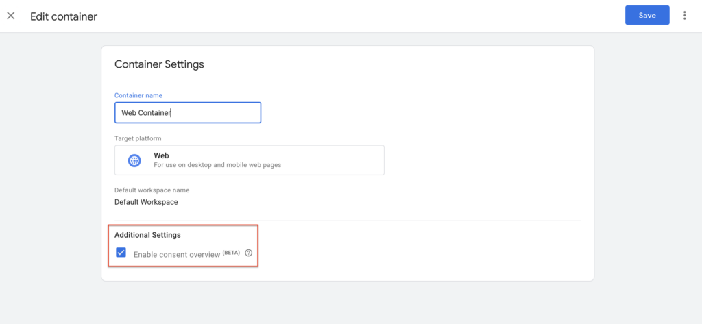1. Enable Consent Mode: Navigate to Admin > Container Settings > Additional settings and enable “Enable consent overview.”