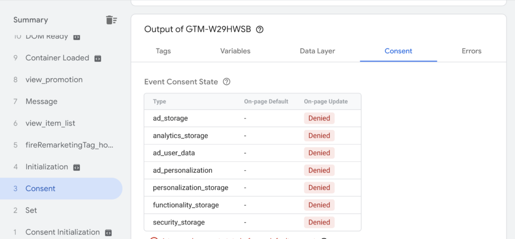 • Set default consent states for various consent types (e.g., ad storage, analytics storage).
