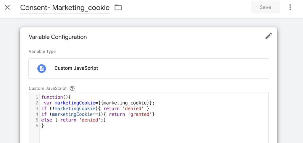 • Now create custom javascript variable for each category: This should return either granted or denied based on user selection on the frontend. Example shown below for custom javascript variable for marketing cookie but you need to do this for each category