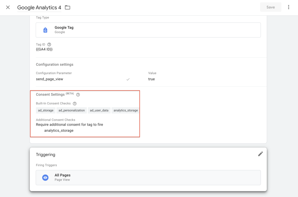 • Associate user consent with tags: Now associate user consent with each tag depending on whether they marketing tags or statistic tags. Example shown below for GA4 tag