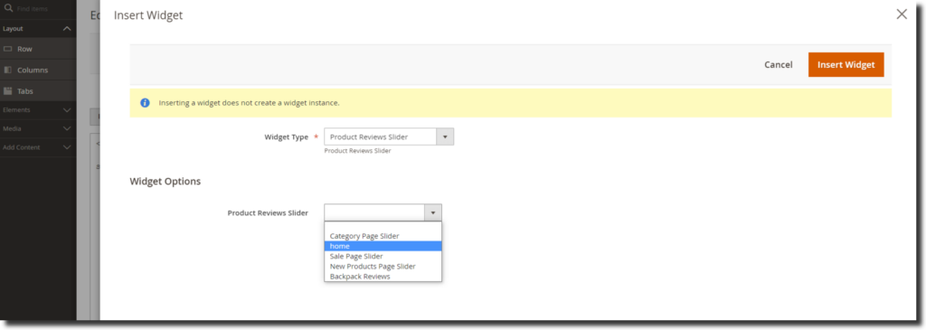 Step 3:- Next, in the Insert widget window, select the Widget Type as ‘Product Reviews Slider’ from the dropdown menu.Under the widget options select the slider that you want to add. Finally insert the widget.