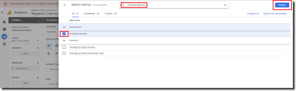 Step 4:- Similarly in metrics search and import ‘Purchase Revenue’.