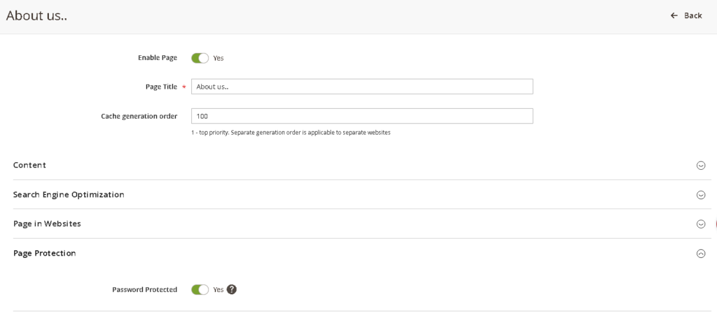 Open any CMS page in Content Pages. You’ll see a dedicated “Page Protection” fieldset with a Password Protected toggle. Set it to Yes and save, that’s it. The page is now gated.