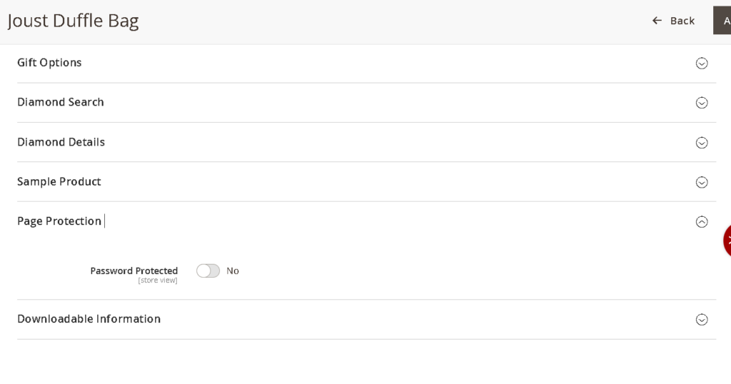 Open any product in Catalog Products. The same Page Protection fieldset appears with an identical toggle. The attribute is scoped to store view level, so you can protect a product on your trade store view while leaving it fully visible on your retail store view. Use this for: wholesale-only SKUs, trade pricing variants, pre-launch products, members-only items, and configurable products with trade-specific options.
