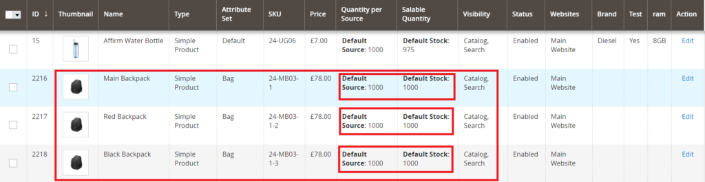 Step 5:- To test our setup, let us place an order with the linked product i.e 24-MB03-1-2 with 1 qty and 24-MB03-1-3 with 1 qty. As we placed the order with 2 qty in total we can see in the below image that the default stock has reduced by 2 for all three products:-