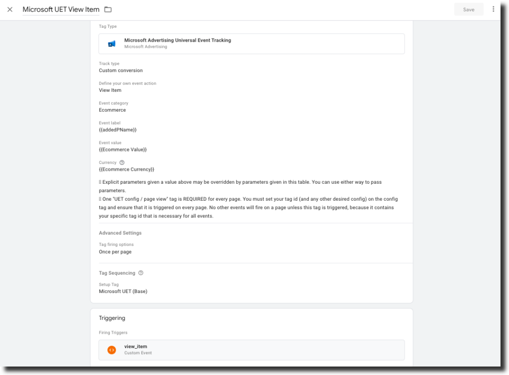 - Check “Don’t fire Microsoft UET View Item if Microsoft UET (Base) fails or is paused”