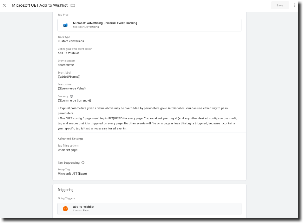 - Check “Fire a tag before Microsoft UET Add to Wishlist fires”