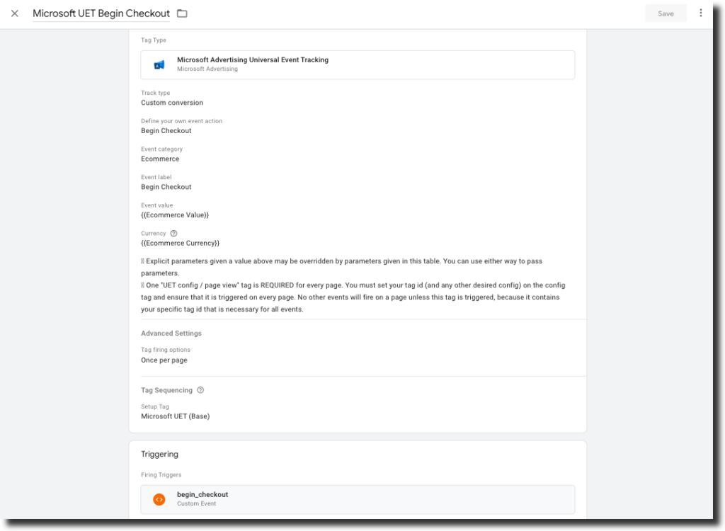 - Check “Don’t fire Microsoft UET Begin Checkout if Microsoft UET (Base) fails or is paused”