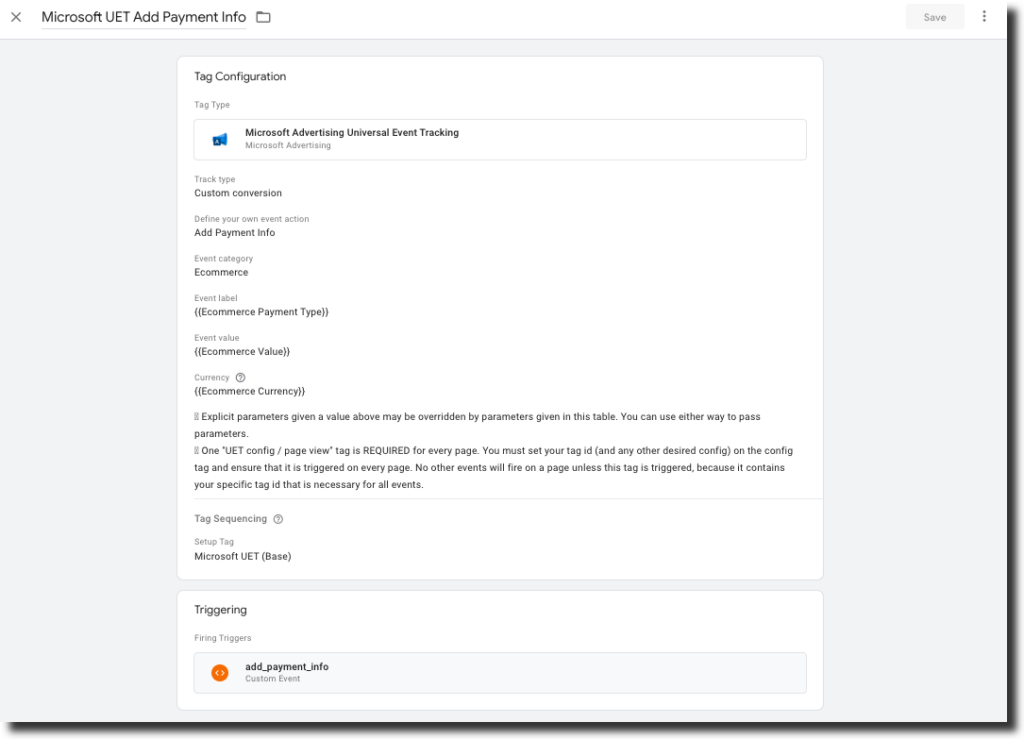 - Check “Don’t fire Microsoft UET Add Payment Info if Microsoft UET (Base) fails or is paused”