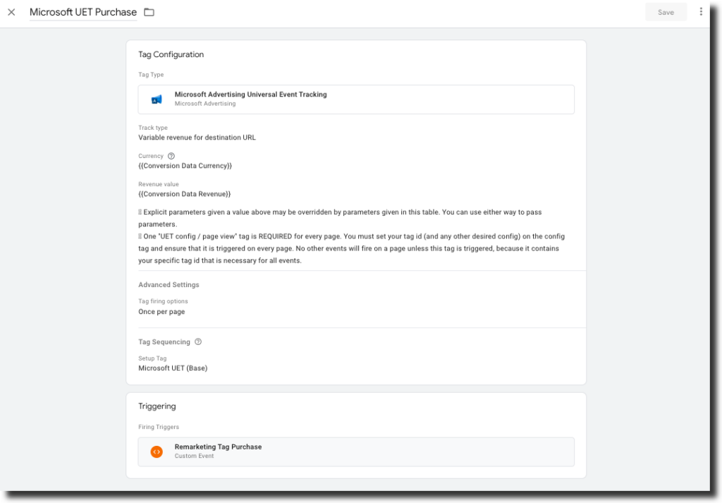 - Check “Fire a tag before Microsoft UET Purchase fires”
