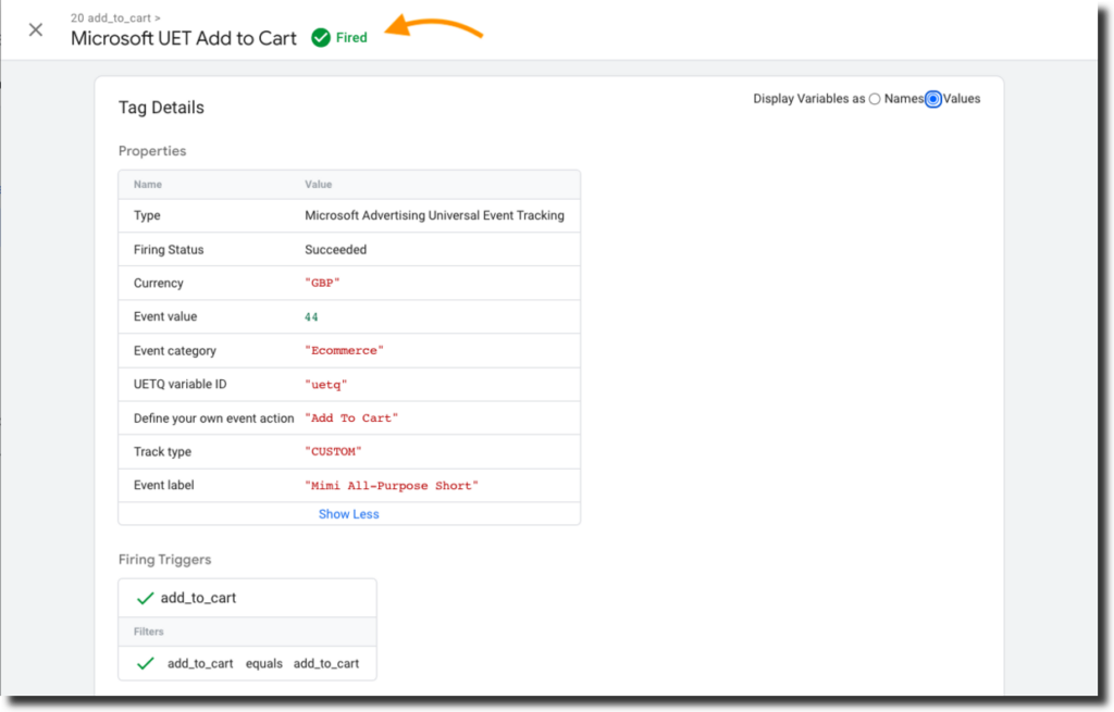 - Check “Fire a tag before Microsoft UET Add to Cart fires”