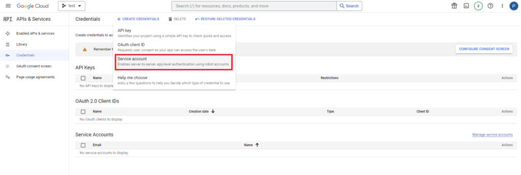- Click on Credentials from the left window then click on Create Credentials and choose service account.