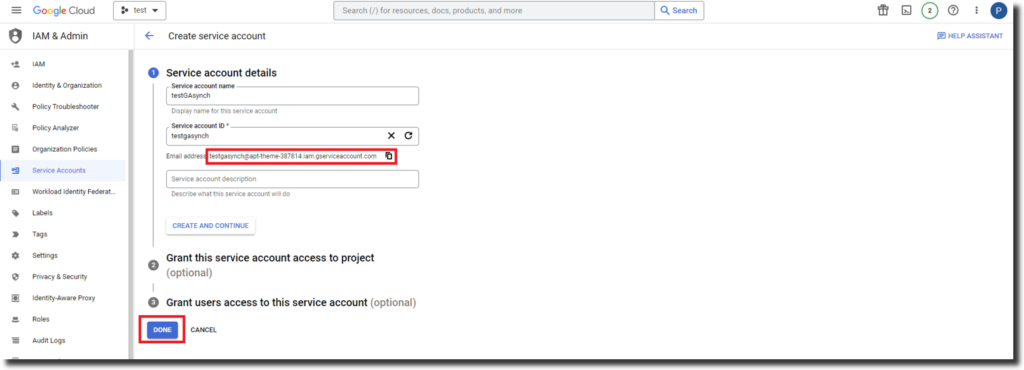 - In the next window, fill in your service account name and description then click on Create. An email will be automatically created as per your name. We need to add this email in google analytics. We will do it in the steps down below. Your service name will be your Application Name that you will enter in the configuration.